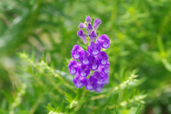 オウゴンという名前から金ぴかのお花が付くイメージがあるかもしれませんが夏に紫蘇に似た紫色のこんな花が咲きます。