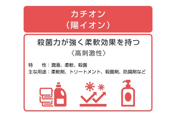 皮膚や髪の毛にくっつく特徴を持ちます。泡を立てて洗うというよりも、お肌や髪の毛にくっついて触り心地をよくしたり、静電気を防ぐなどの作用や殺菌効果があります。