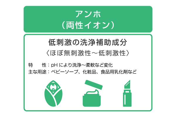 「コカミドプロピルベタイン」や「ココアンホ酢酸Na」など「ベタイン」や「アンホ」などの単語がつくものや、たまごを使った天然の乳化剤「水添レシチン」も両性型に分類されます。