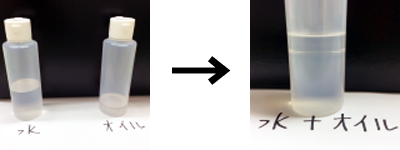 油汚れが落とせるということは、オイルと仲が良くないといけません。ということはモンモリロナイトはお水とオイルの間を取り持って、混ぜることができるのでは?と思い、実験してみました。