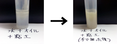 実験の結果、そんなときにもモンモリロナイトが活躍することがわかりました。モンモリロナイトには水と油どちらも吸着して抱きかかえ、クリーム状にできるちからがあります。
