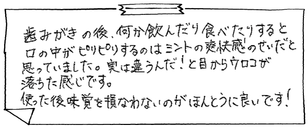 歯みがきの後、何か飲んだり食べたりすると口の中がピリピリするのはミントの爽快感のせいだと思っていました。実は違うんだ!と目からウロコが落ちた感じです。使った後味覚を損なわないのがほんとうに良いです!