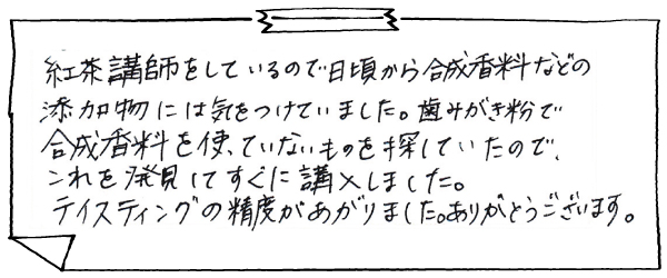 紅茶講師をしているので日頃から合成香料などの添加物には気を付けていました。歯みがき粉で合成香料を使っていないものを探していたので、これを発見してすぐに購入しました。テイスティングの精度があがりました。ありがとうございます。