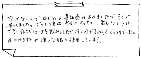 泡がないので、はじめは違和感がありましたが、すぐに慣れました。ブラシ後は本当にスッキリし、歯もツルツルです。オレンジジュースを飲みましたが全く味が変わらずビックリでした。歯みがき粉が嫌いな娘も使用しています。