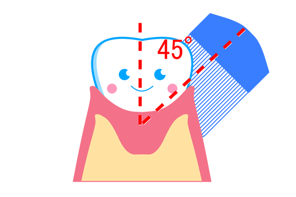歯と歯ぐきの境目に向けて45度の角度で歯ブラシを当て、細かく前後に動かしましょう。