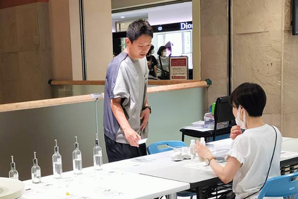 デパートの真ん中で振るだけ簡単モンモリロナイトワークショップをやっている様子です。