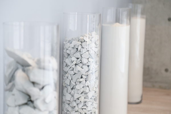 経過に従ってだんだん石が細かくなっていき、最終的には実際にKURUMUで使われているとっても細かい粉末が展示してあります。