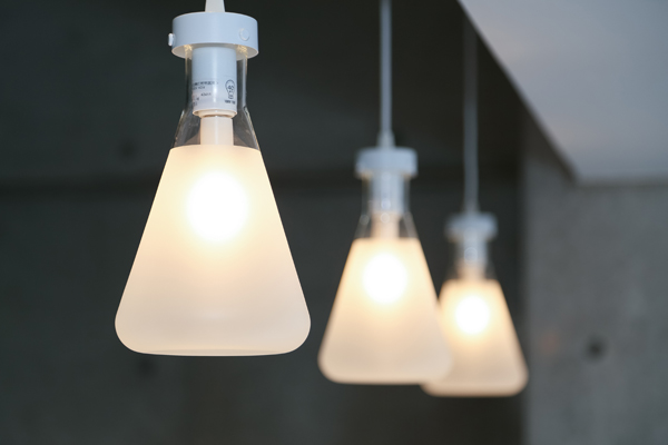 上が粘土を研究している場所ということもあり、照明はフラスコを使ったもの。
