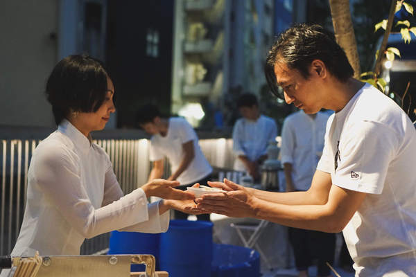 巫女となった新田さんがカカオを一人ひとりに入れていきます。