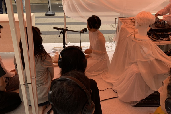 皆さん受神器(ヘッドフォン)を装着し、同じ音楽を聴きながら巫女となった新田さんの言葉に耳を傾けます。