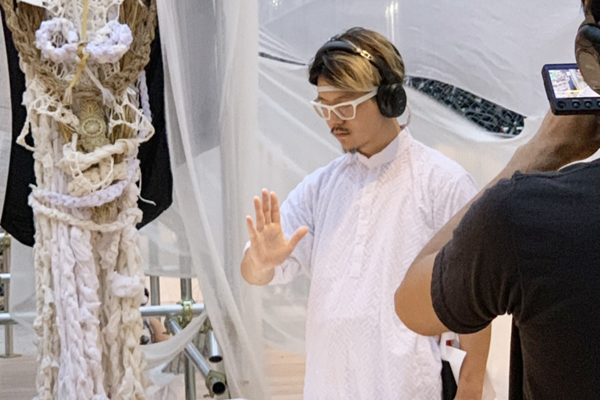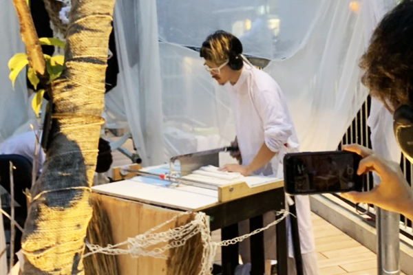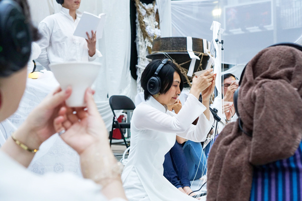 再び受神器を装着、参加者全員が同じ音楽を聴いているところにダンサー登場。妖艶な踊りと共にうどん打ちの儀が始まります。
