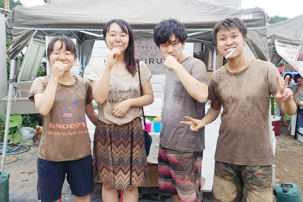 KURUMUのブースではおなじみ、泥フェスでモンモリロナイト歯磨きです。泥だらけでスタッフも笑顔!