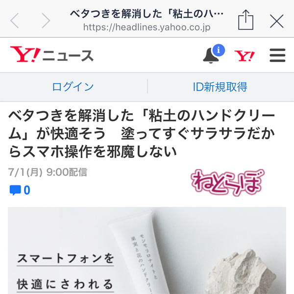 「ねとらぼ(ベタつきを解消した「粘土のハンドクリーム」が快適そう 塗ってすぐサラサラだからスマホ操作を邪魔しない)」や「ロケットニュース(ベタつきづらいと豪語する「粘土のハンドクリーム」をガチで検証してみた)」