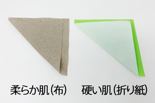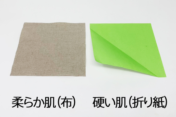 柔らか肌の布は全くしわがついていません。対する固い肌の折り紙はしっかりとしわが…